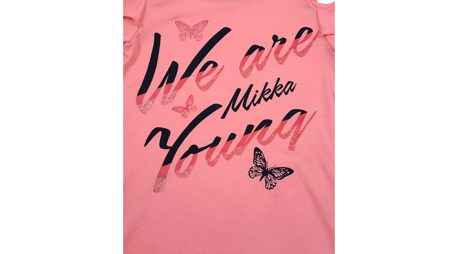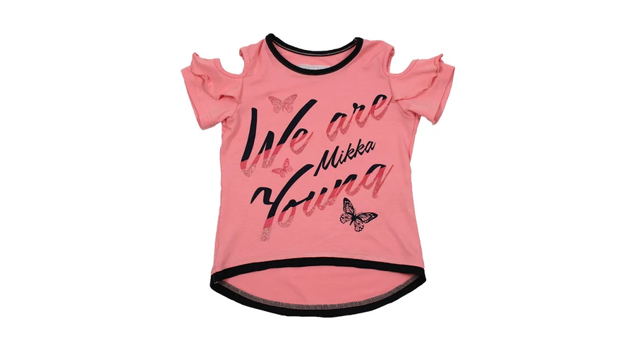 | Korall színű, lepkés vállu fodros újjú lány pamut póló.Lányok nagy kedvence mert kicsit kinnt lehet a válluk.Hátul picit hosszabb.95% viszkoz 5% elasztán. |